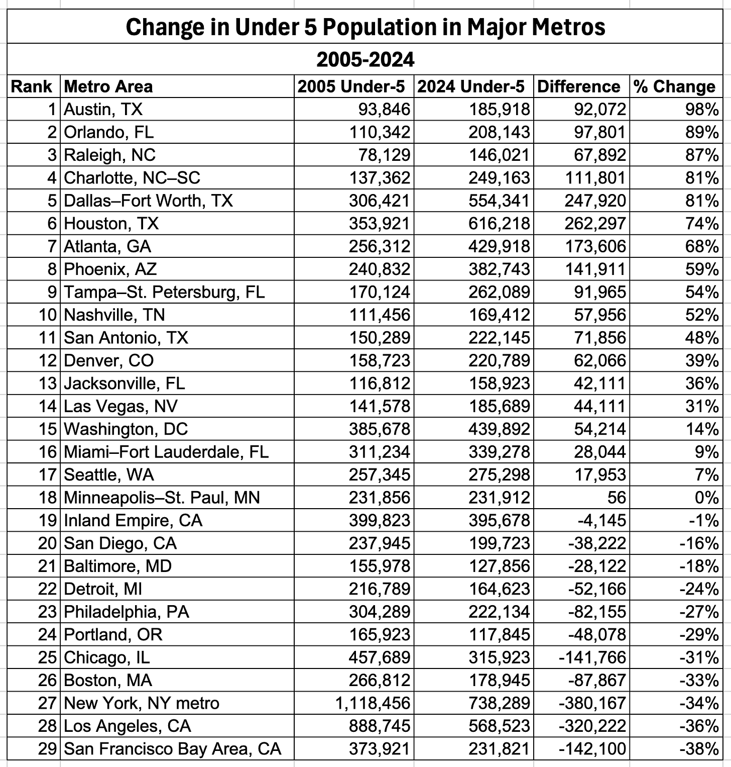 Between 2005 and 2024, the under-five population — tthe clearest indicator of where young families are choosing to live — exploded in Sun Belt metros and collapsed in many coastal and legacy cities. Austin (+98%), Orlando (+89%), Raleigh (+87%), and Charlotte (+81%) surged. Meanwhile, Chicago (–31%), Boston (–33%), New York (–34%), Los Angeles (–36%), and the San Francisco Bay Area (–38%) lost enormous shares of their youngest residents.