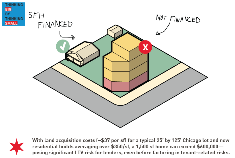 The financial landscape of urbanism has also shifted dramatically. In Chicago’s early days, an individual or small developer could purchase a 25’ by 125’ lot and build a modest home or mixed-use building. Today, land costs (average cost of residential land in Chicago is estimated around ~$37/sf 14) and hard construction fees (+$300/sf) make it difficult for low-equity developers to compete.6 Lenders typically favor large, uniform developments with predictable LTV (loan to value) ratios,7 further sidelining the possibility of incremental, diverse growth. Standardized FDIC underwriting criteria historically aligned with lender preference over missing infill, like townhomes or sixplexes.8 Mixed-use or creative, funky development is even harder to finance.9