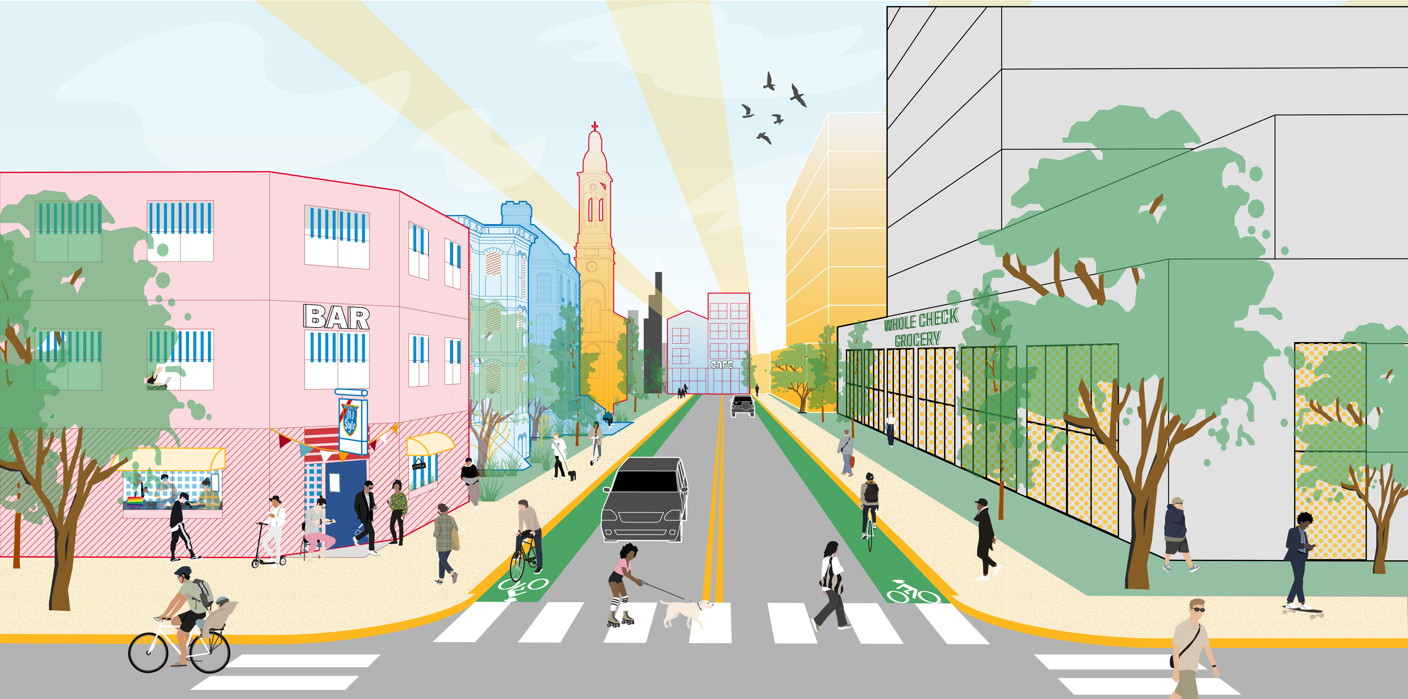 The emergent model allowed Chicago to adapt to changing needs over time. Landowners were free to build according to market demand. Residential areas included homes for a variety of incomes, while commercial corridors hosted local grocers, cafes, and specialty shops, sustained by the surrounding community. Density was not imposed but evolved naturally as families converted single-family homes into flats or added storefronts to accommodate economic activity. Home owners could rent units to immigrants or those otherwise unable to afford new construction, allowing more affordability.4 What made this model successful was its flexibility which allowed filtering of use over lifecycles and micro- and macroeconomic trends.