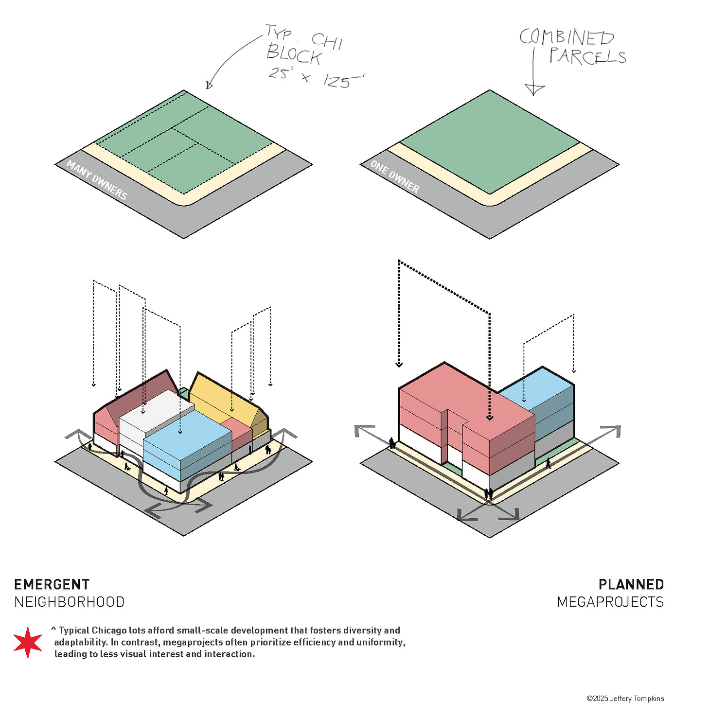 There is a key difference between the way we used to build places and the way we do now. For instance, in Chicago, traditional neighborhoods were built incrementally, shaped by emergent processes and market forces rather than blanket master plans. The city’s iconic neighborhoods grew on the backs of 25’ by 125’ parcels, subdivided from larger tracts of land.1 These parcels were sold to a diverse mix of small-scale investors, developers, and homebuilders, each contributing to the patchwork of the urban fabric.