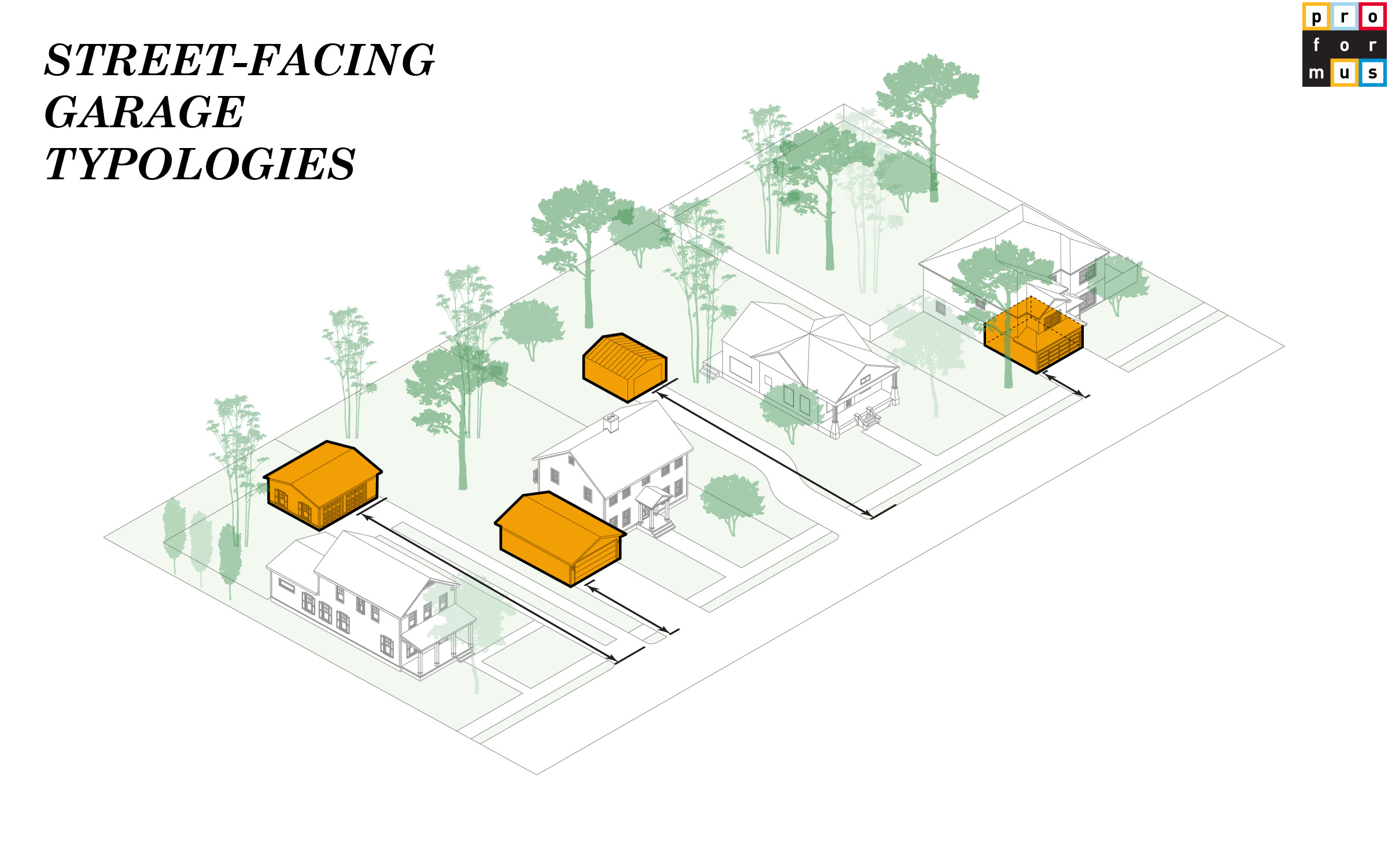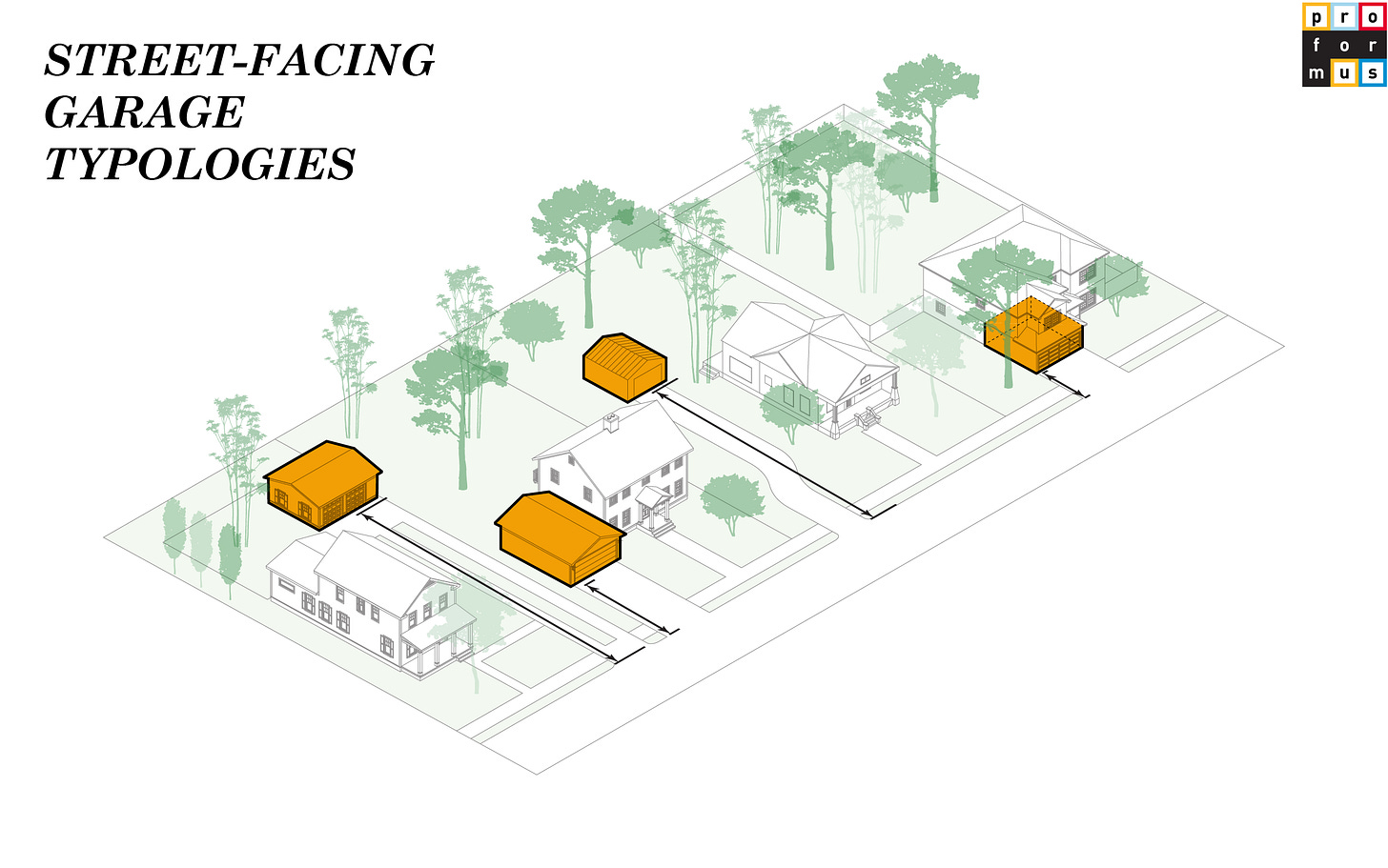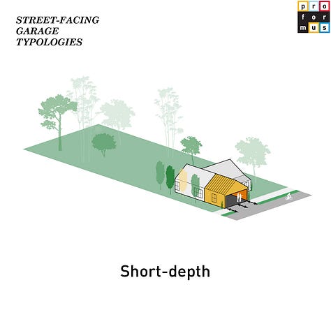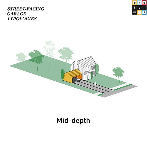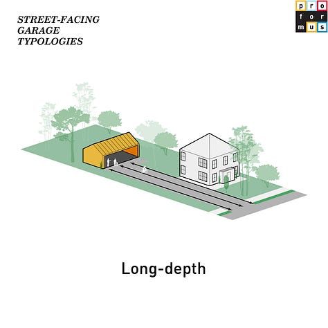 Typically embodied by more suburban development, street-facing garages sit at the front line of neighborhood life. They shape the public edge and how a parcel greets the sidewalk. When reimagined, they can repair the street, turning blank doors into transparent thresholds, or transforming dead facades into small civic rooms, studios, or micro-shops that invite eye contact and activity. In best case scenarios, they can replace the best emergent properties that porches originally held before they themselves were replaced with garages. Depth of the garage setback from the street is crucial for any sort of future activation: those closer to the street can create a more porch-like atmosphere, while those away create more of a sense of intrigue and intimacy - both have their advantages.