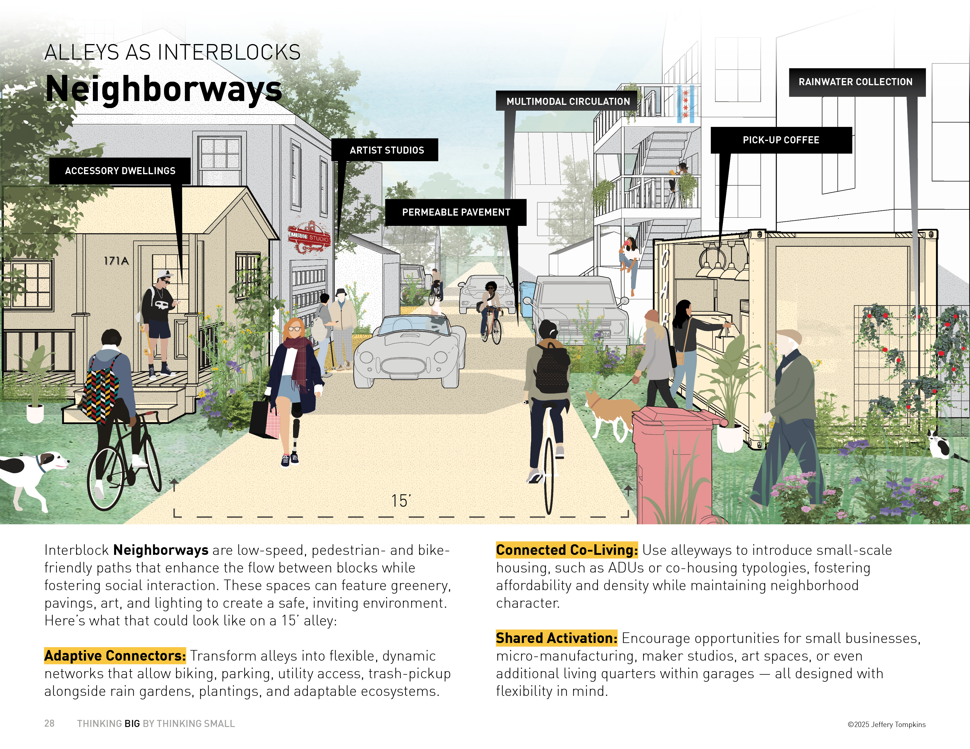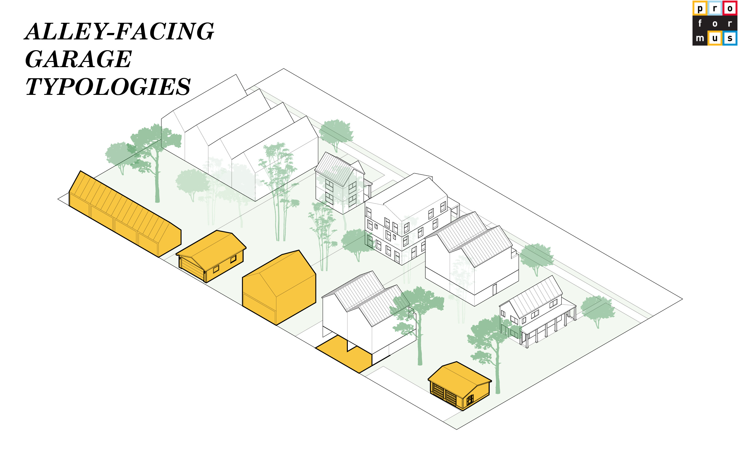 Alley-facing garages, by contrast, occupy the city’s hidden spine: the back-of-house realm of bins, fences, and utility poles. Usually found in older neighborhoods built before advent of automobile-centric development, they’re the quiet, forgotten spaces now primed for reuse. Their challenge is activation. How do we turn storage into social space? How do we make the alley walkable, livable, and alive again?